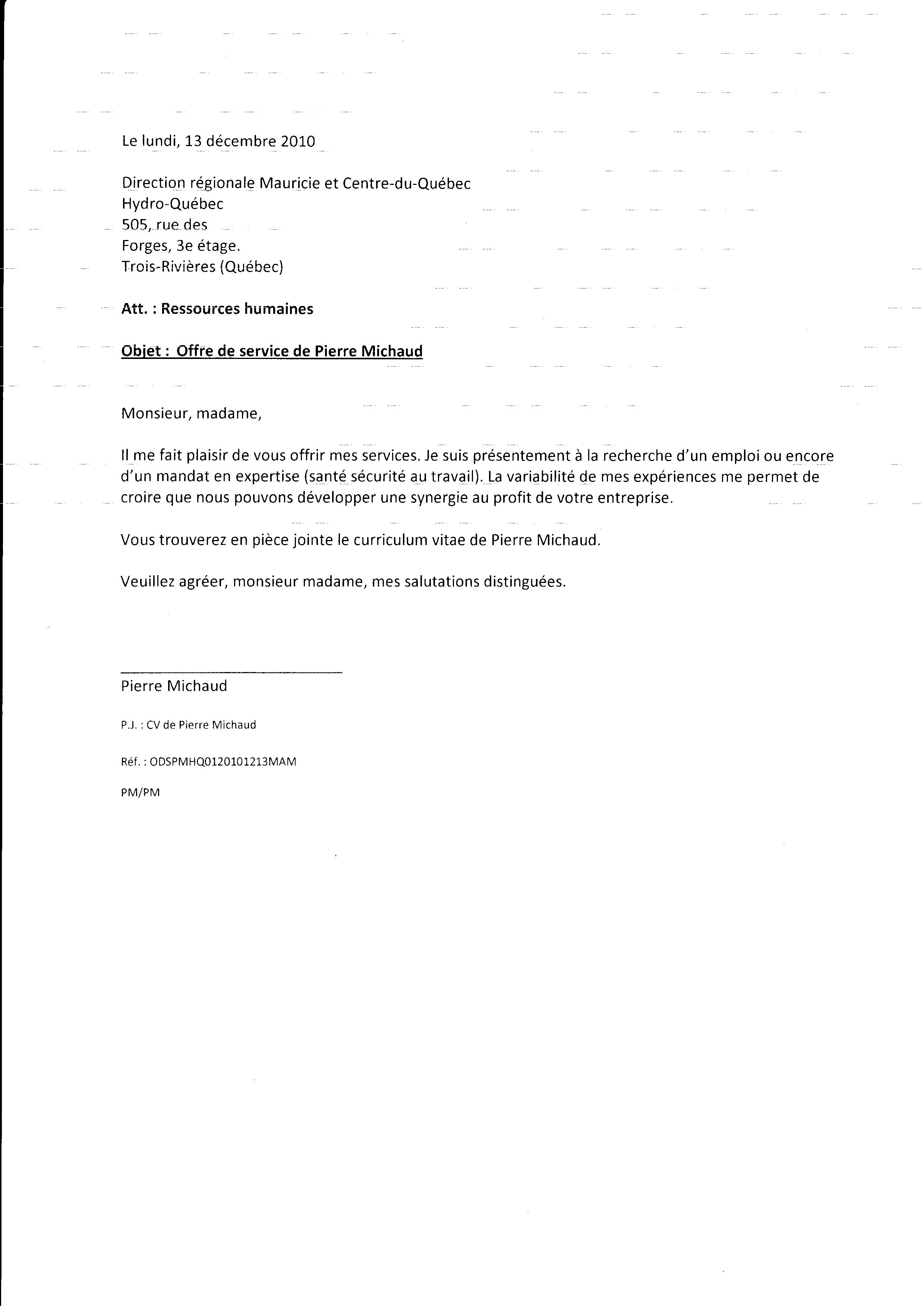 | 142 | Offre de service a Hydro Québec (ODSPMHQ0120101213MEM) le 13 décembre 2010 | TR141 |