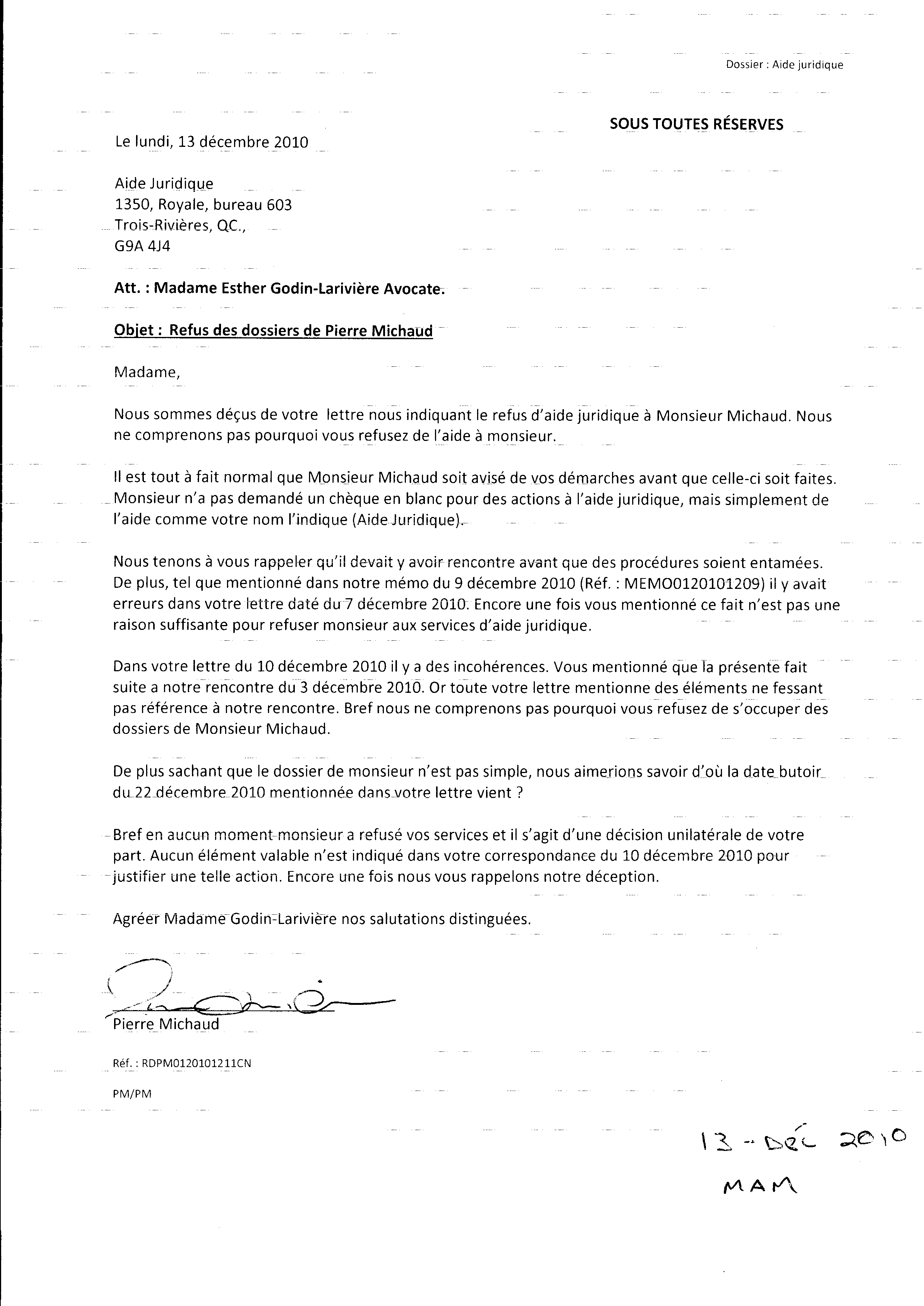 | 144 | Lettre (RDPM0120101211CN) a l'aide juridique de Trois-Rivières concernant le refus de l'aide juridique de s'occuper de mon dossier le 13 décembre 2010 | TR143 |