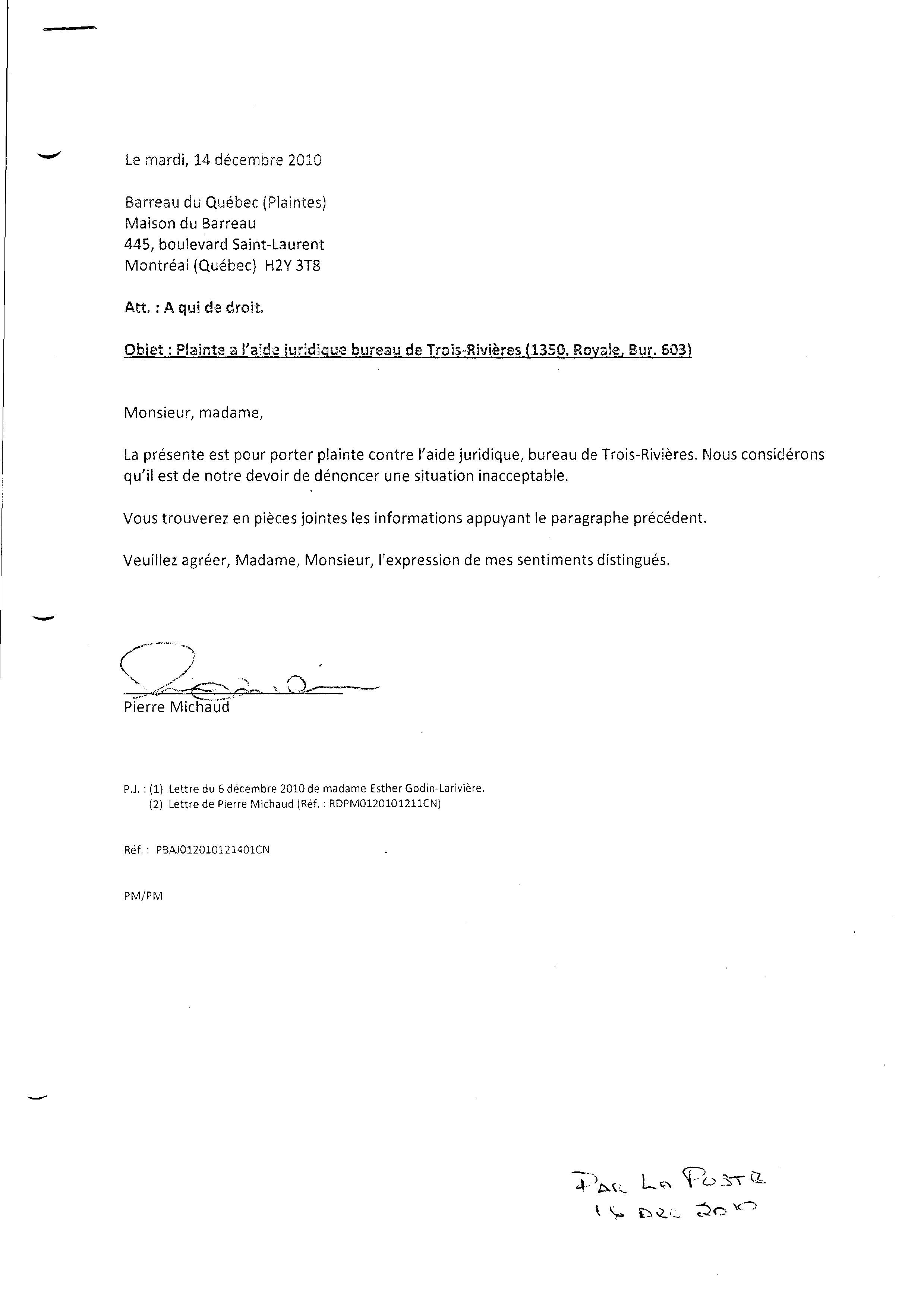 | 145 | Lettre (PBAJ012010121401CN) de plainte au Barreau adressé au 445 Boul St-Laurent à Montréal le 14 décembre 2010 | TR144 |